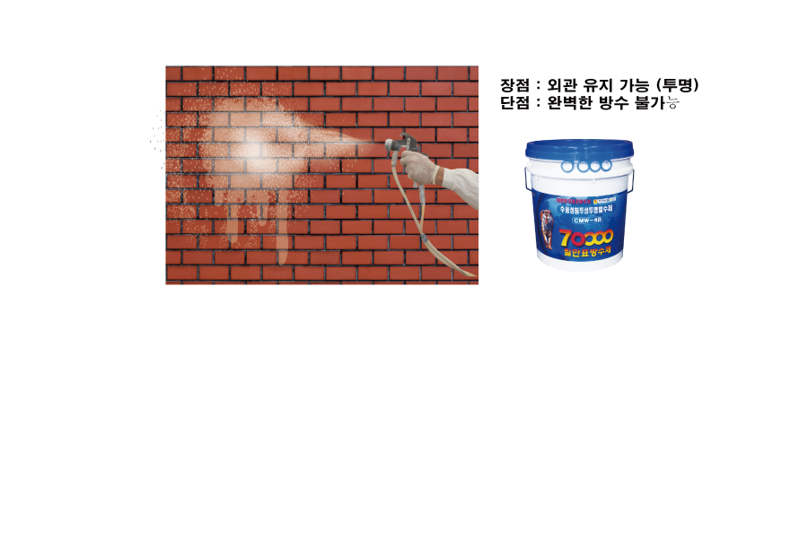 발수제는 특성상 2-3년 주기적으로 도포 합니다. 물을 튕겨 침투가 안되게 하나 완벽한 방수는 아닙니다. 태풍처럼 강한 바람을 동반한 비가 지속적으로 들이닥칠 경우 (10방울 중 2-3방울)은 안으로 누수가 발생될 수 있습니다. 시공 방법에 대해 알아보시려면 여기를 클릭해주세요